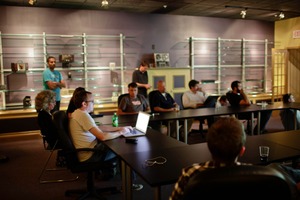 In a softly lit meeting room, a diverse group of individuals leans in, engaged in a discussion. A man at the front, illuminated by the glow of his laptop, contrasts with the contemplative expressions of those seated, creating a mood of concentrated collaboration and shared ideas.