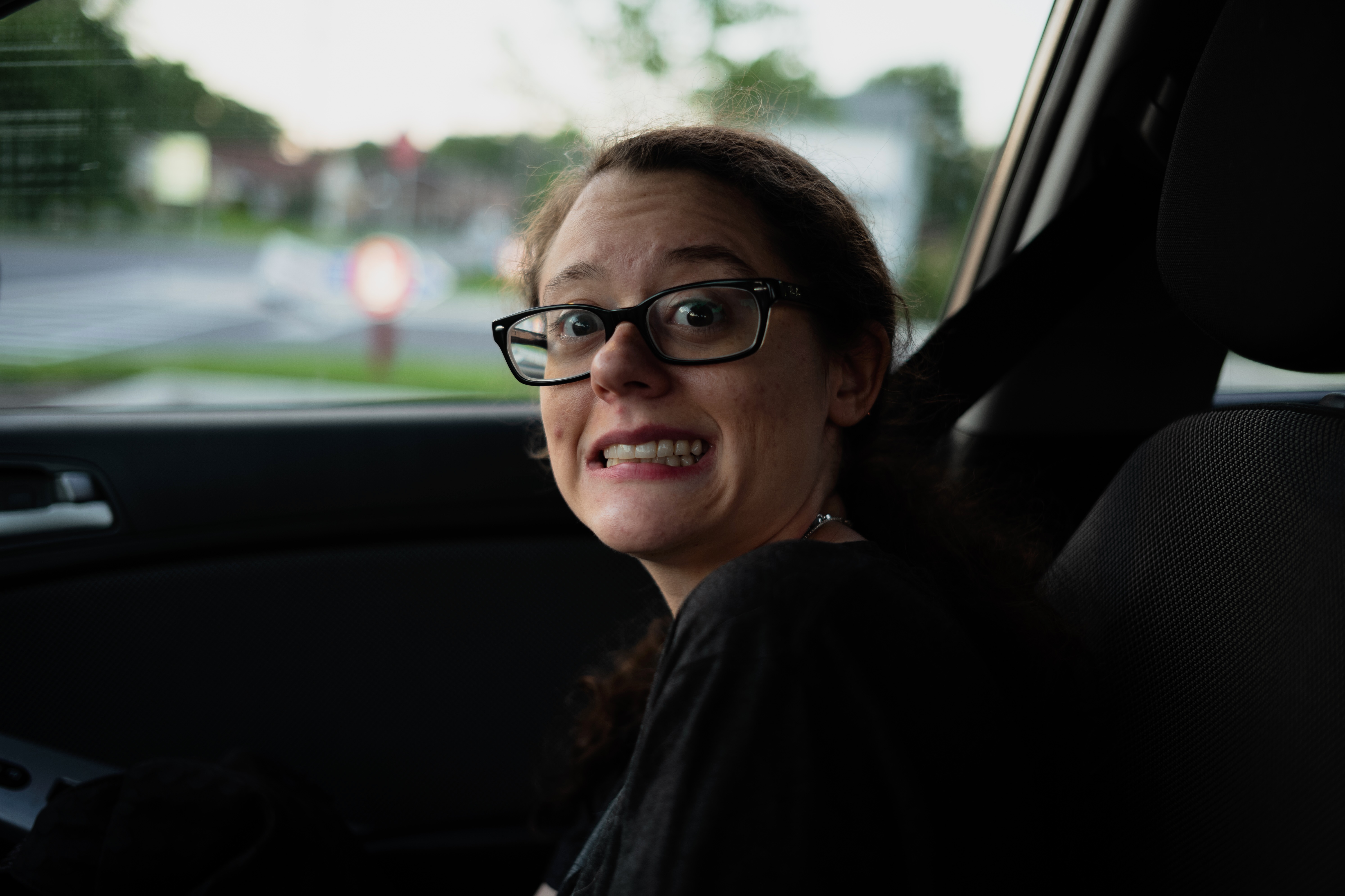The photograph captures a woman seated in a car, wearing glasses and smiling with a hint of surprise. The warm light filtering through the window complements her expression, creating an inviting yet playful mood. The composition draws focus to her face against the blurred backdrop of the outdoor scene, enhancing the sense of spontaneity.