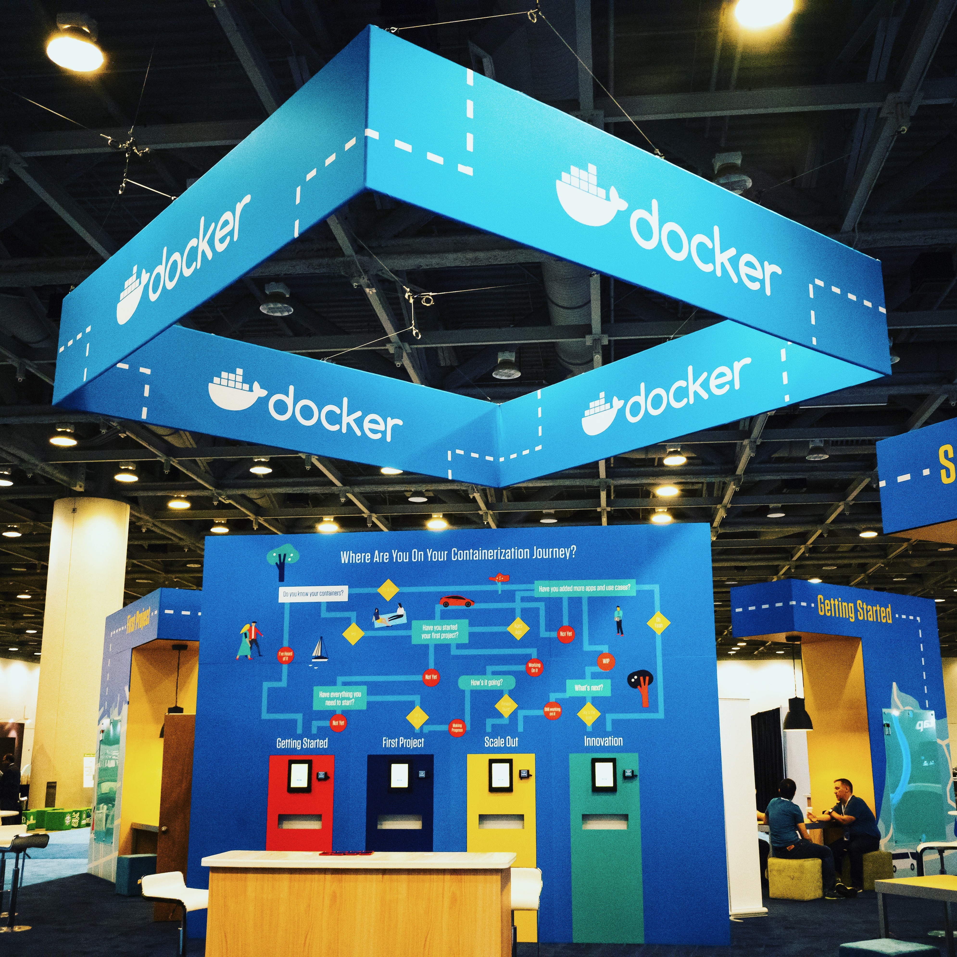 The photograph showcases a vibrant Docker exhibition stand, dominated by a striking blue color. It captures a modern, tech-savvy ambiance, highlighting a clever illustrated guide on the workflow of containerization. The ambient lighting casts a professional yet inviting mood, inviting attendees to engage with the interactive elements of the display.