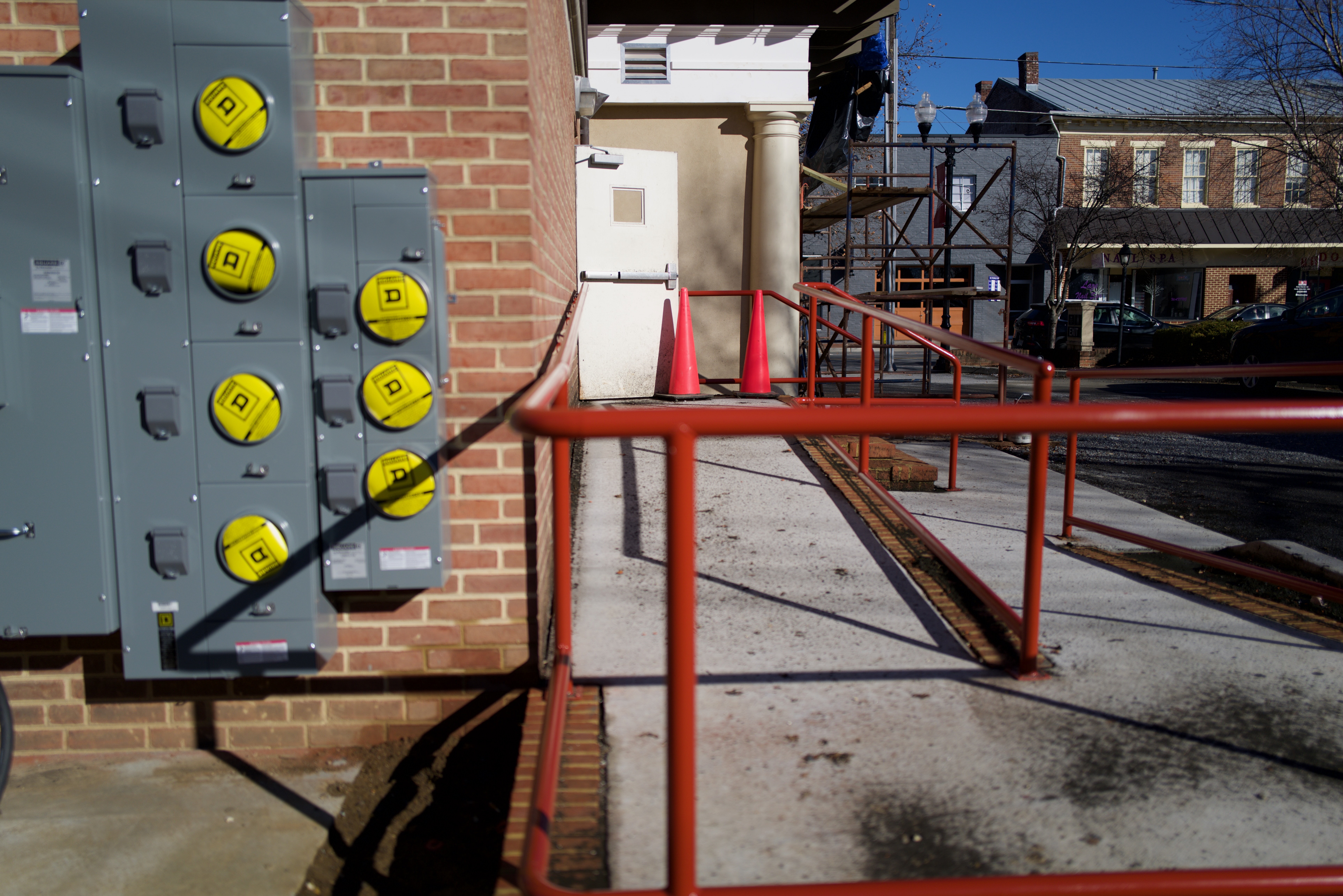 This photograph captures a gritty urban scene, focusing on a textured brick wall adorned with industrial electrical panels. Bright yellow buttons contrast sharply against the muted tones of the surroundings, while the angled ramp and red railings guide the viewer's eye toward the distant street, evoking a sense of movement and anticipation. Clear, bright lighting emphasizes the starkness of the setting, creating a mood that is both functional and reflective of urban life.