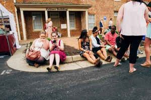 In this vibrant photograph, a group of young adults relaxes on the curb outside the Feltner Building, their casual attire and relaxed postures creating an inviting atmosphere. Soft, natural lighting bathes the scene, enhancing the sense of camaraderie as they engage with their phones and each other. The textured brick backdrop adds depth, framing this snapshot of a leisurely moment among friends.