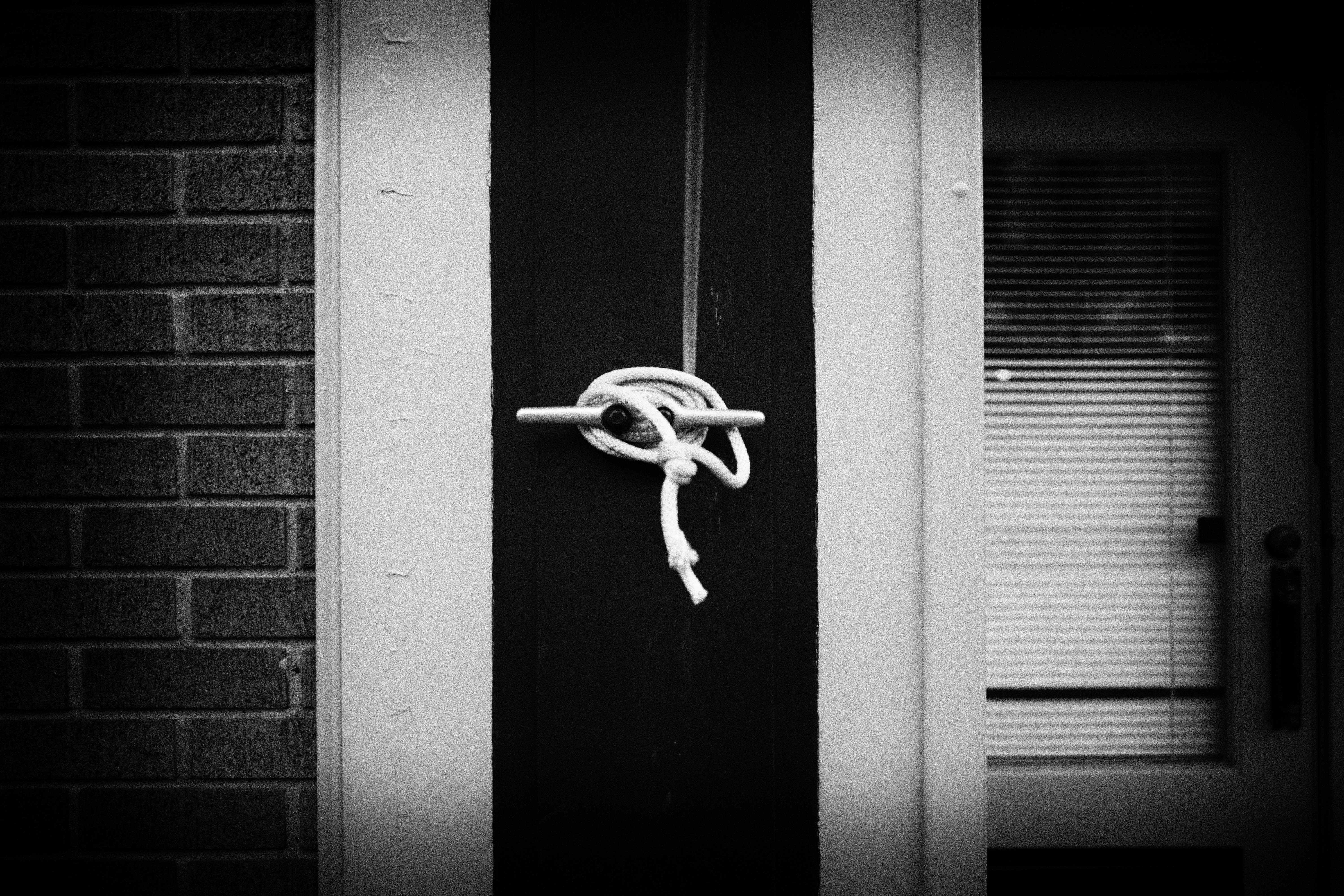 This photograph captures a close-up of a neat knot secured to a door post, surrounded by stark contrasts of light and shadow. The monochromatic palette enhances the mood of simplicity and introspection, while the composition draws the viewer's eye directly to the intricate details of the knot. The subtle textures of the brick and door add a quiet backdrop, emphasizing the solitary subject—a reminder of connection and stability amidst stillness.
