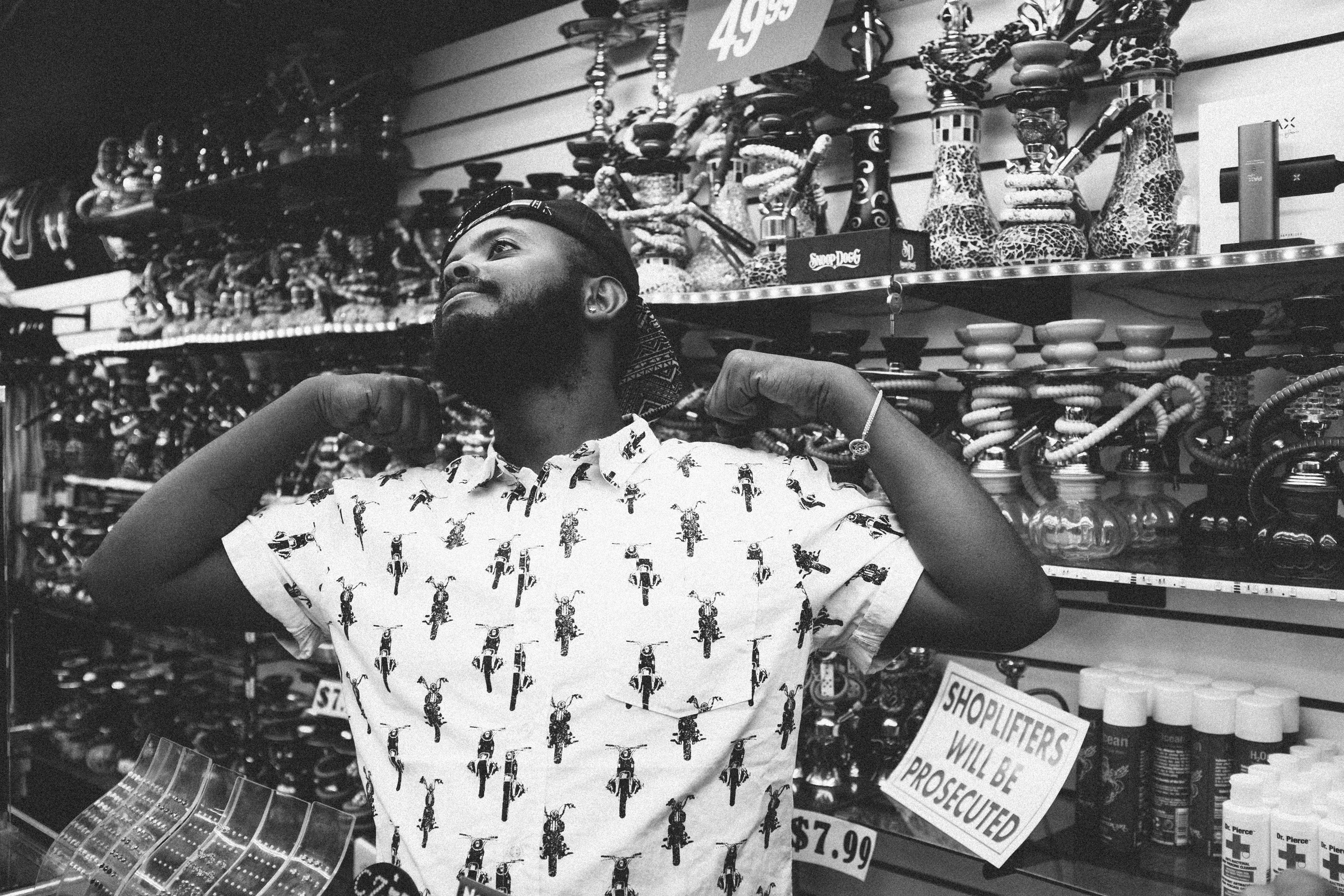 In a vibrant smoke shop, a man confidently strikes a pose, showcasing his stance amidst a backdrop of colorful hookahs and bottles. The black-and-white filter adds a moody, vintage feel, contrasting with the lively array of products around him. His expression exudes pride and defiance, captured in a moment that seems both spontaneous and purposeful.