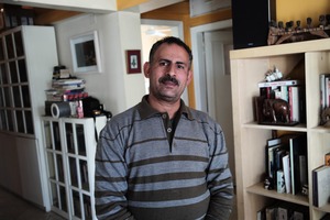 In a cozy indoor setting illuminated by soft, ambient light, a man stands confidently with a subtle smile, creating a warm and inviting atmosphere. The background, filled with books and personal items, adds depth and tells a story of a life well-lived. The composition draws attention to him while conveying a sense of calm and introspection.