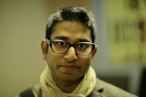 In this intimate portrait, a man exudes a sense of quiet contemplation, framed against a softly blurred background. His earnest gaze is softened by warm lighting, which highlights his features and the texture of his scarf. The composition draws the viewer in, crafting a mood of sincerity and mindfulness.
