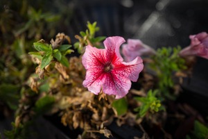 A vibrant pink petunia flower stands out amidst wilting foliage, capturing the delicate contrast of life and decay. The soft lighting enhances the intricate veins of the petals, creating a gentle, inviting mood that evokes a sense of resilience. The composition draws the eye to the flower, making it the focal point against a background of fading greenery.
