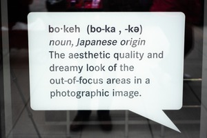 This photograph captures a definition of 'bokeh' displayed in a speech bubble format, emphasizing the concept's aesthetic quality. The bright white text contrasts against the muted background, inviting viewers to ponder the dreamy allure of out-of-focus areas in photography. The composition draws the eye toward the text while hinting at an artistic environment beyond the glass.