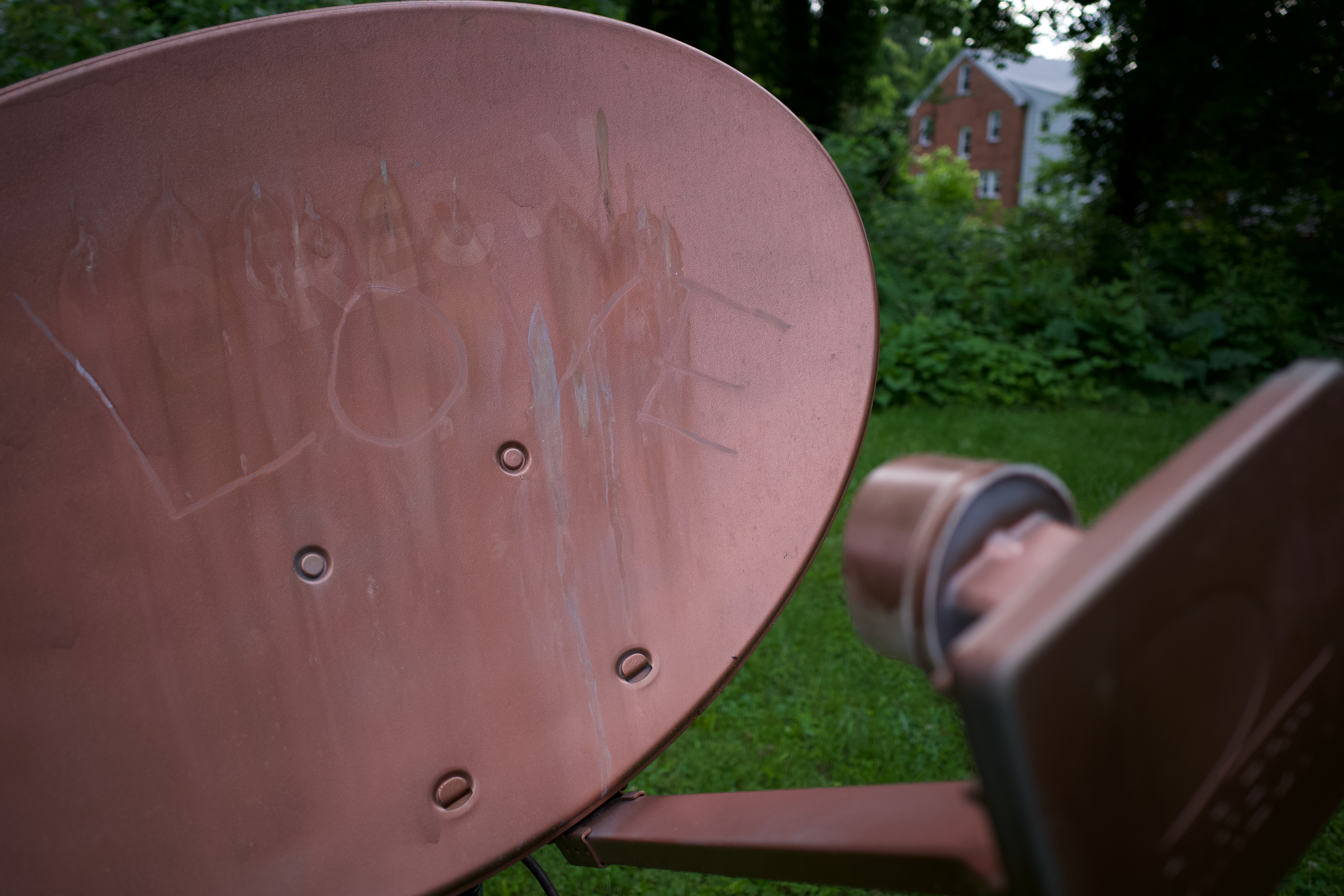 The photograph captures a close-up of a weathered satellite dish, revealing faint etchings of the word 'LOVE' amidst scratches and grime. The muted tones of the dish contrast with the lush green backdrop, creating a poignant, melancholic mood. Soft, diffused lighting enhances the sense of nostalgia, inviting contemplation about communication in a disconnected world.