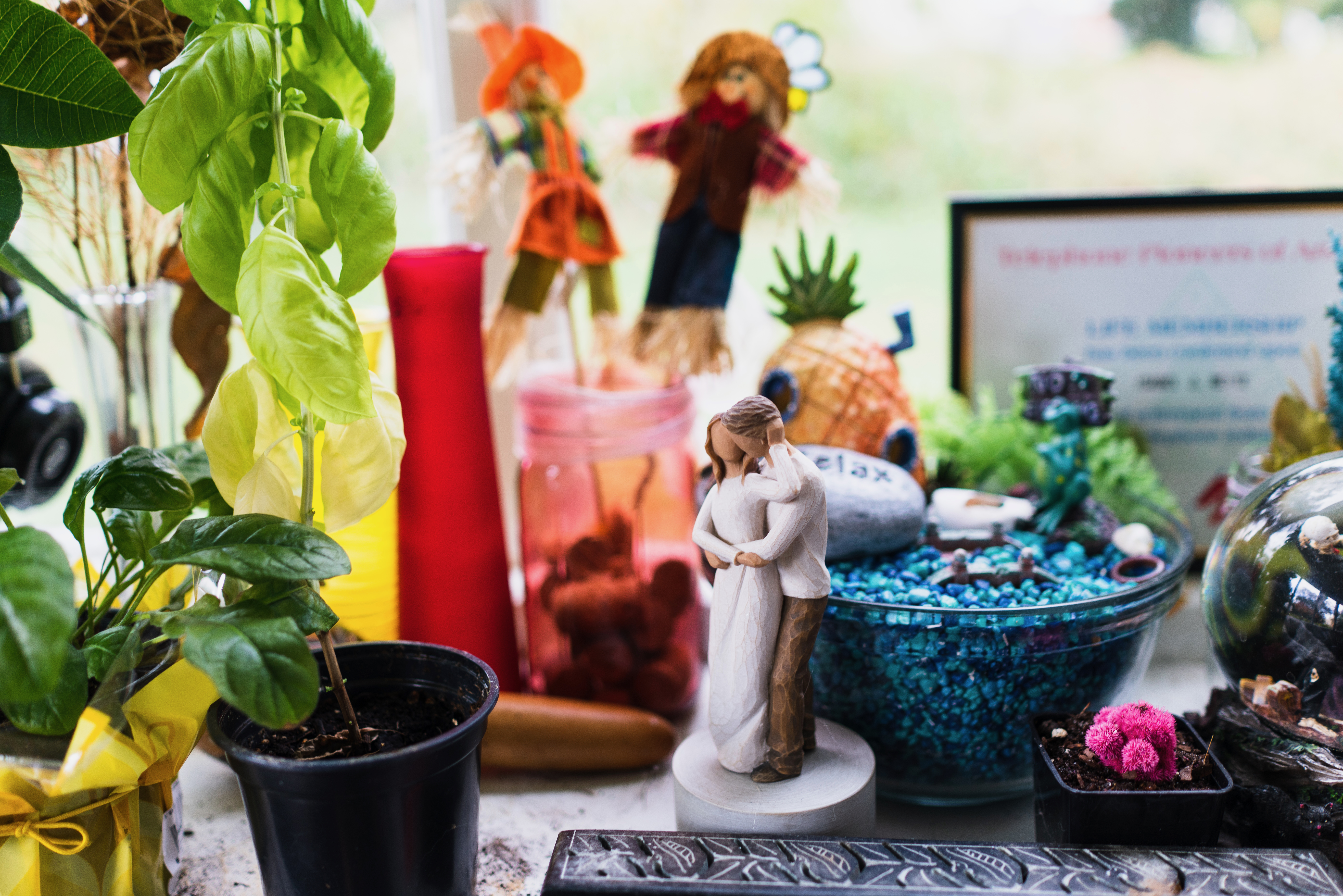 This vibrant photograph captures a delightful arrangement of knickknacks, plants, and a couple figurine nestled in a sunlit window. The warm light enhances the cheerful atmosphere, highlighting the diverse textures of the plants and decorative items. The composition is rich and layered, inviting the viewer to explore its many elements, from the lively greenery to the intimate couple's embrace.