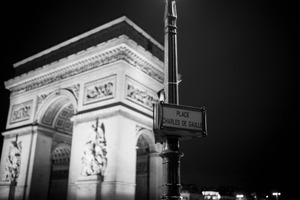 The photograph captures the grandeur of the Arc de Triomphe, its intricate sculptures illuminated against the dark night sky. A street sign reading 'Place Charles de Gaulle' is prominently featured, drawing the viewer's attention to the historic location. The monochromatic tones evoke a timeless mood, emphasizing the architectural beauty and significance of this iconic monument.