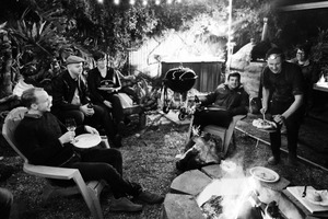 In this intimate monochrome scene, a group of friends relaxes around a crackling fire, their faces softly lit by the warm glow. The composition captures a casual camaraderie as one person serves food while others engage in light conversation, enveloped in the lush greenery and rustic charm of the outdoor setting. The mood is cozy and inviting, evoking a sense of nostalgia for shared moments among friends.