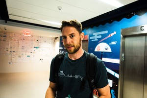 A man stands in a brightly lit corridor adorned with colorful, playful art, exuding a casual yet thoughtful demeanor. His slight smile and the backpack suggest a blend of relaxation and readiness, capturing a moment of everyday life. The vibrant background contrasts with the neutral lighting, adding an air of creativity and whimsy to the scene.