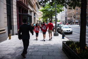 A vivid street scene captures a group of fans sporting matching red jerseys, exuding camaraderie and team spirit. The bright daylight illuminates the bustling cityscape, contrasting with a solitary figure in a suit walking in the opposite direction. The lush greenery overhead adds a touch of life to the urban environment, enhancing the lively mood of the scene.