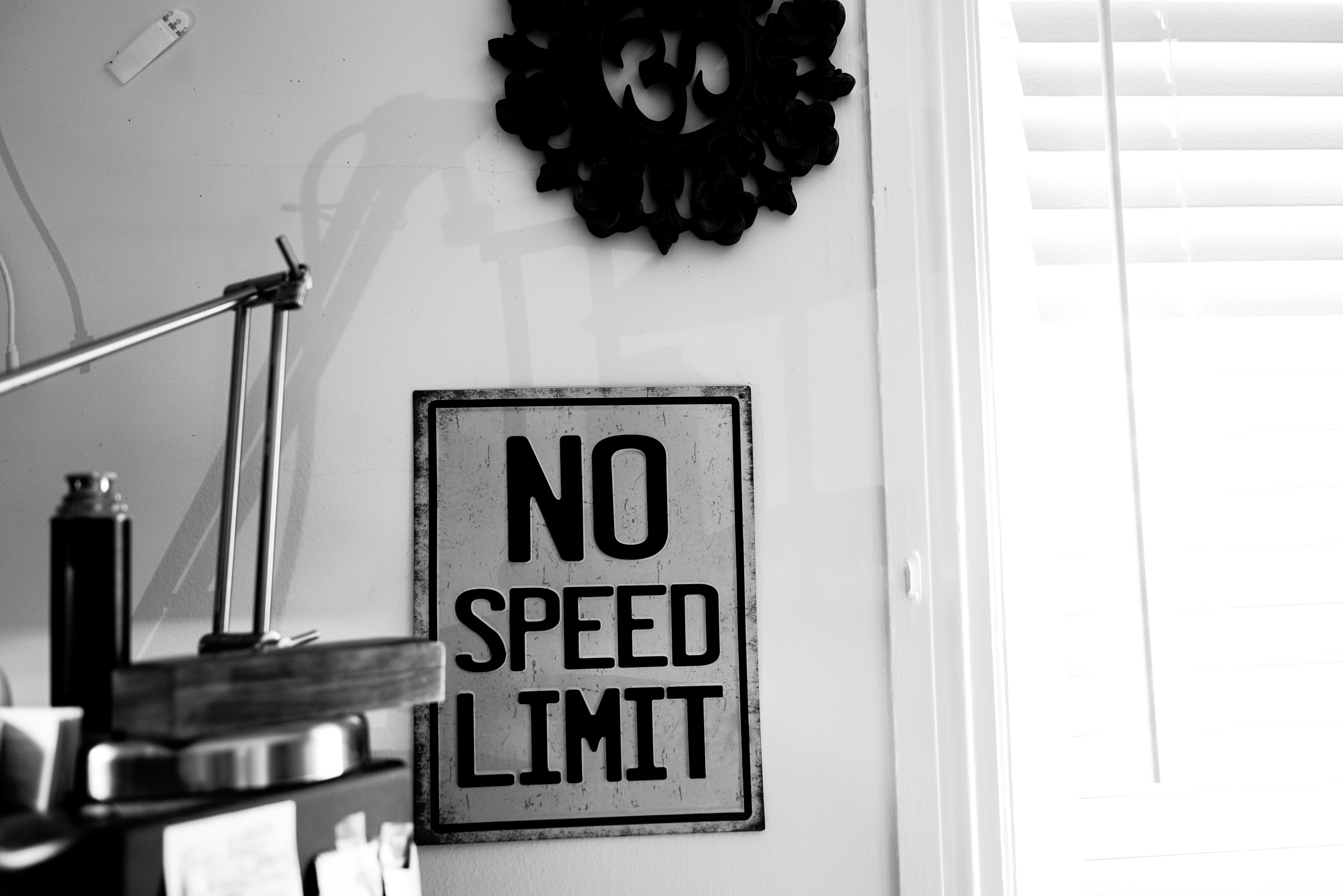 The photograph captures a monochromatic scene featuring an imposing 'NO SPEED LIMIT' sign, juxtaposed against a softly lit wall adorned with decorative elements. The stark contrast of light and shadow creates a contemplative mood, inviting viewers to reflect on the freedom suggested by the sign amidst a backdrop of stillness. The composition balances industrial charm and artistic expression, showcasing a blend of modernity and nostalgia.