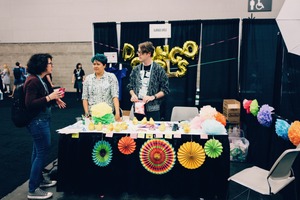 The photograph captures a lively scene at a convention booth, where two vendors engage with an attendee, their expressions animated and welcoming. Colorful decorations adorn the table, creating a festive atmosphere that contrasts against the muted backdrop of the venue. Soft lighting enhances the warm vibe, inviting a sense of community and creativity.