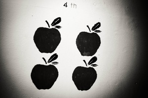 This photograph captures a minimalist display of hand-painted black apples against a stark white wall, creating a contrast that is visually striking. The simplicity of the composition and the monochromatic palette evoke a sense of nostalgia and whimsy, reminiscent of school days. Above the apples, the faint inscription '4th' adds a hint of curiosity, inviting viewers to ponder the significance of this playful yet thoughtful artwork.