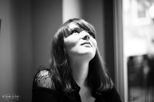 A young woman gazes upward, her expression a mixture of hope and introspection. The soft, diffused light highlights her features, casting gentle shadows that add depth to the moment. The monochromatic tone enhances the mood, creating a serene yet thoughtful atmosphere.