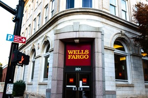 The photograph captures the imposing exterior of a Wells Fargo branch, characterized by its classic architectural details and crisp signage. Bright natural light highlights the stonework and large windows, creating a welcoming yet professional atmosphere. The presence of street signs and traffic lights adds dynamic context to this urban setting.