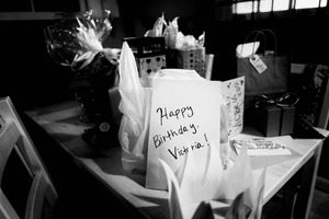 The photograph captures a cozy birthday scene, marked by a handwritten card that reads 'Happy Birthday, Victoria!' resting atop a cluttered table. The monochrome tones lend a nostalgic mood, emphasizing the warmth of personal celebration amidst the surrounding gifts and wrapping. Soft, diffused lighting creates gentle contrasts, highlighting the textures and the intimate atmosphere of the gathering.