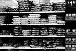 In this striking black-and-white photograph, rows of Oreo packages dominate the shelves of a grocery store, creating a visual rhythm of stacked shapes and textures. The composition evokes a sense of nostalgia and consumerism, while the contrasting light highlights the depth of the boxes. The overall mood is both intriguing and reflective, inviting a deeper contemplation of everyday choices.