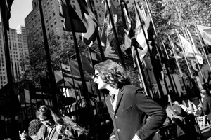 In this striking black-and-white photograph, a young man stands out with his stylish attire and reflective sunglasses, seemingly engaged in conversation amidst a flurry of international flags. The high-contrast lighting casts sharp shadows, creating a dynamic mood that captures the energy of urban life. The composition, with figures framed by flags and skyscrapers, evokes a sense of movement and cultural diversity in a bustling city setting.