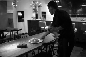 In a softly lit restaurant, a lone server sets a wooden table with care, emphasizing a quiet moment before the dining experience begins. The monochrome tones accentuate the contours of his focused expression and the elegantly arranged plates of food. The composition captures both the warmth of hospitality and the solitude of anticipation, creating a mood of understated elegance.
