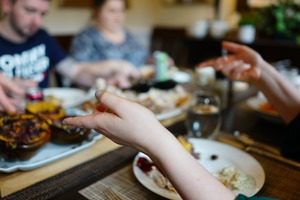 In this inviting dining scene, hands gesture animatedly over a shared meal, emphasizing warmth and connection among the diners. The soft, natural light illuminates the food and the intricate details of the moment, creating a cozy atmosphere that highlights the joy of togetherness. The blurred background draws attention to the intimacy of the gathering, where conversation and laughter seem to weave through the air.