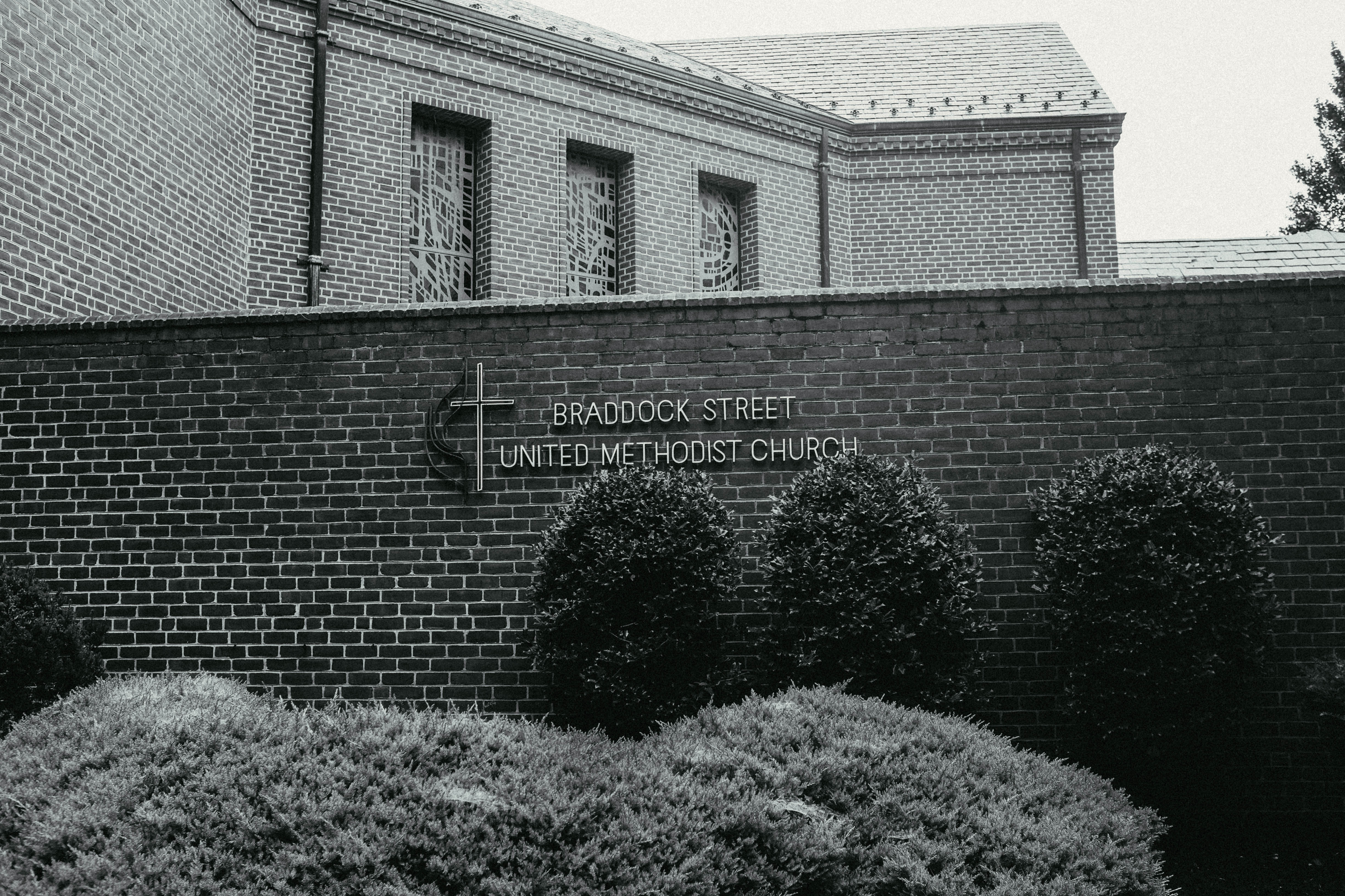This photograph captures the Braddock Street United Methodist Church, framed by a neatly manicured hedge and set against a brick wall. The stark black-and-white composition adds a contemplative mood, emphasizing the church's structure and the simplicity of its surroundings, while soft diffused light creates a serene atmosphere.