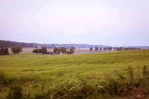 A tranquil landscape unfolds, featuring lush green fields that stretch towards distant hills. The soft, diffused light casts a gentle mood over the scene, evoking a sense of peace and solitude. The subtle layers of trees and farmland create a harmonious composition that invites viewers to linger in the quiet beauty of nature.