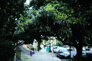 A verdant canopy stretches overhead, framing a quiet city sidewalk bathed in soft, diffused light. The rich greens of the foliage contrast elegantly with the muted tones of the pavement and nearby cars, creating a serene and inviting atmosphere. This tranquil scene invites passersby to pause and appreciate the intersection of nature and urban life.