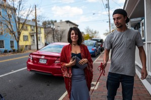 A woman smiles warmly, draped in a flowing red shawl, her casual yet stylish outfit contrasting with the gritty urban backdrop. Next to her, a man walks with a relaxed demeanor, holding a leash in one hand, suggesting companionship and an easy camaraderie between them. The soft, diffused light adds a serene mood to the scene, highlighting the vibrant colors of the urban environment.