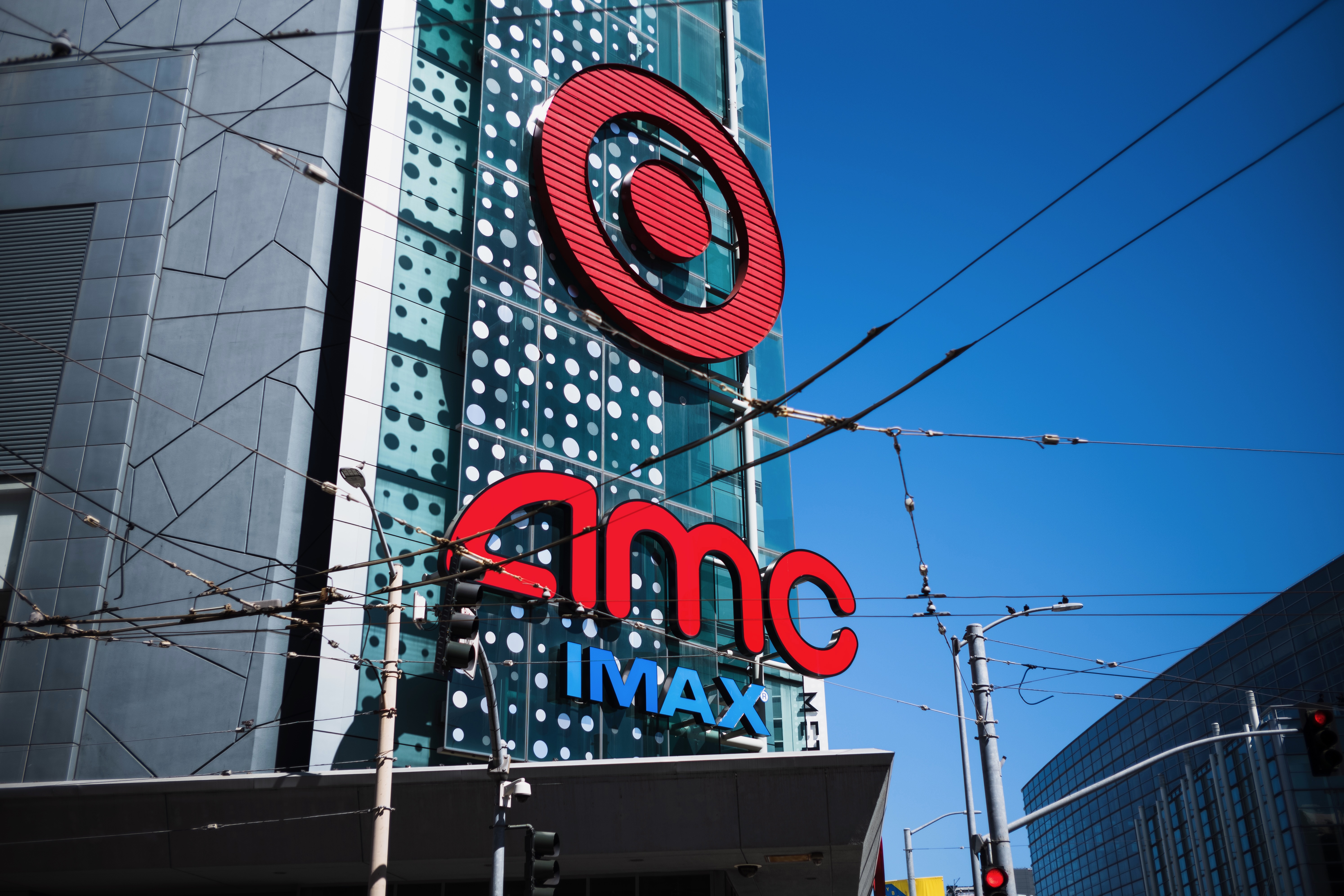 The photograph captures the vibrant exterior of an AMC IMAX theater, its bold red signage prominently displayed against a clear blue sky. The modern architecture, interspersed with geometric patterns and reflections, exudes a lively, contemporary mood, evoking excitement for cinematic experiences. Sharp lighting accentuates the colors and details, creating a striking visual contrast amidst the urban landscape.