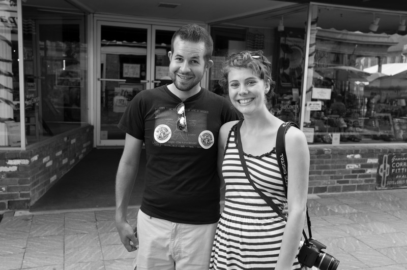 In this charming black-and-white photograph, two young adults stand closely together, radiating warmth and camaraderie. Their smiling expressions, contrasted against the bustling background of shops, create a lighthearted and inviting atmosphere. The soft, diffused lighting enhances the subjects while emphasizing the casual setting of their shared moment.