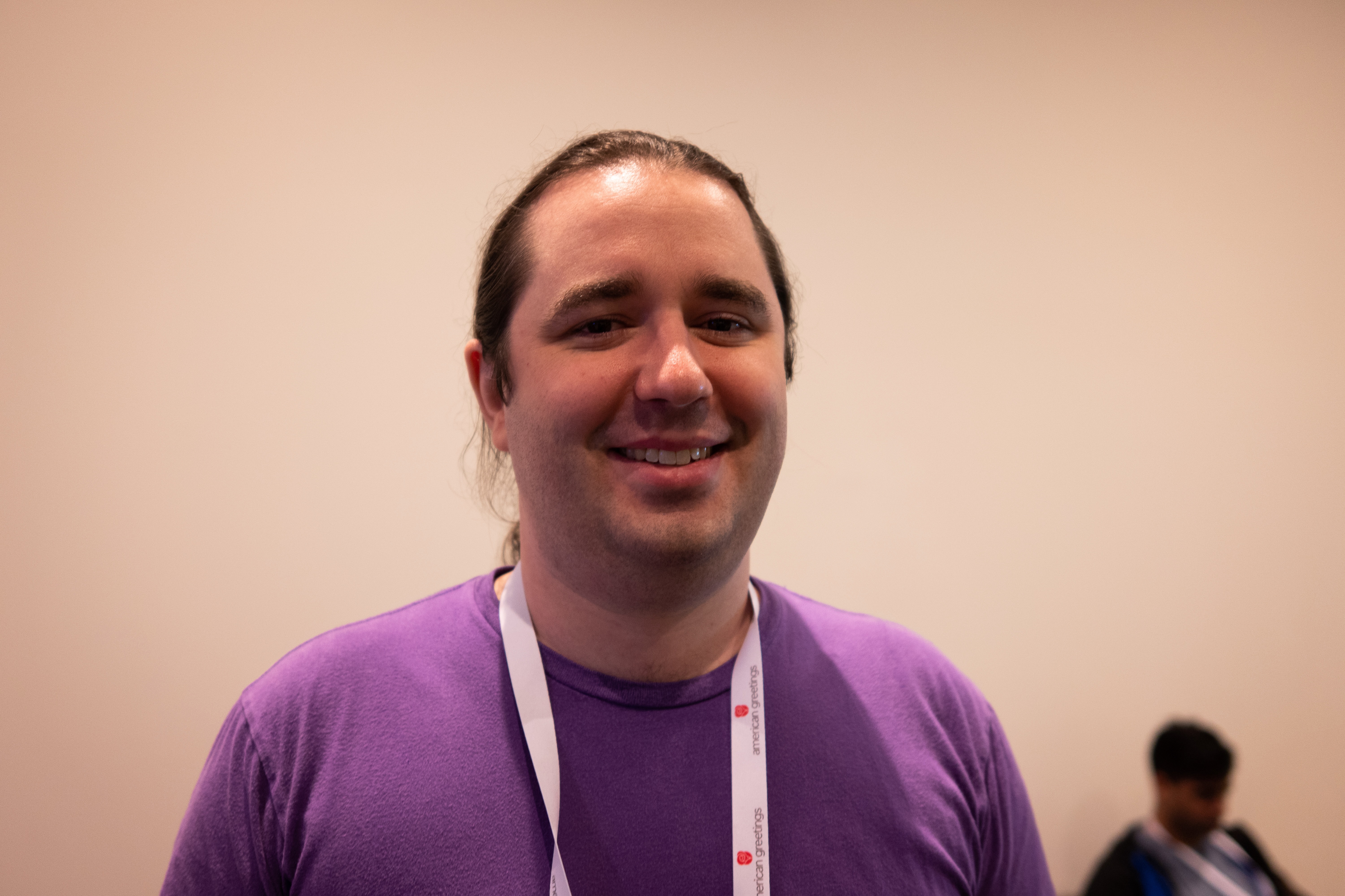 In this warm and inviting portrait, the subject beams with a friendly smile, exuding an air of approachability and enthusiasm. The soft, diffused lighting creates a gentle ambiance, highlighting the man’s casual attire and relaxed demeanor against a muted background, adding to the overall inviting mood. A figure in the background adds a sense of context, hinting at a lively environment.