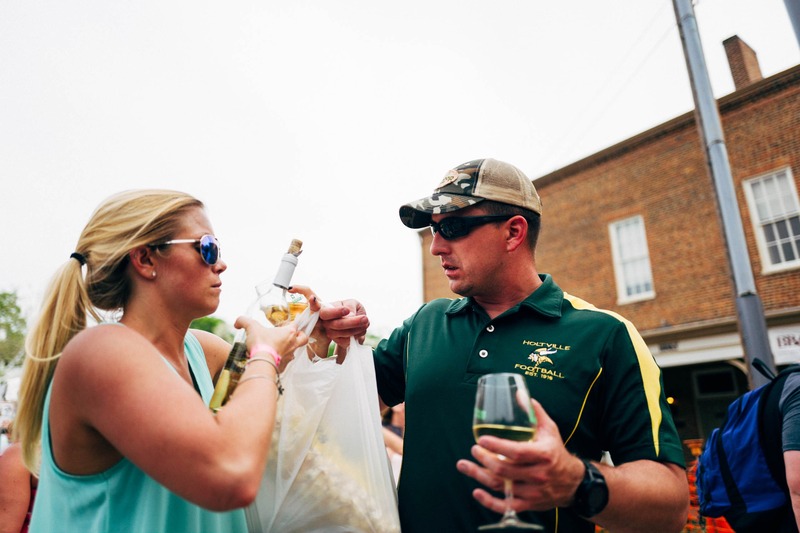 In a lively outdoor setting, two individuals are engaged in a spirited exchange, showcasing a casual yet engaging atmosphere. The woman, casually dressed and wearing sunglasses, holds a bag while the man, clad in a sports-themed polo, gestures animatedly as he balances a glass of wine in one hand. The soft, diffused lighting adds a warm, inviting tone to the scene, accentuating the mix of relaxation and energy of the surroundings.
