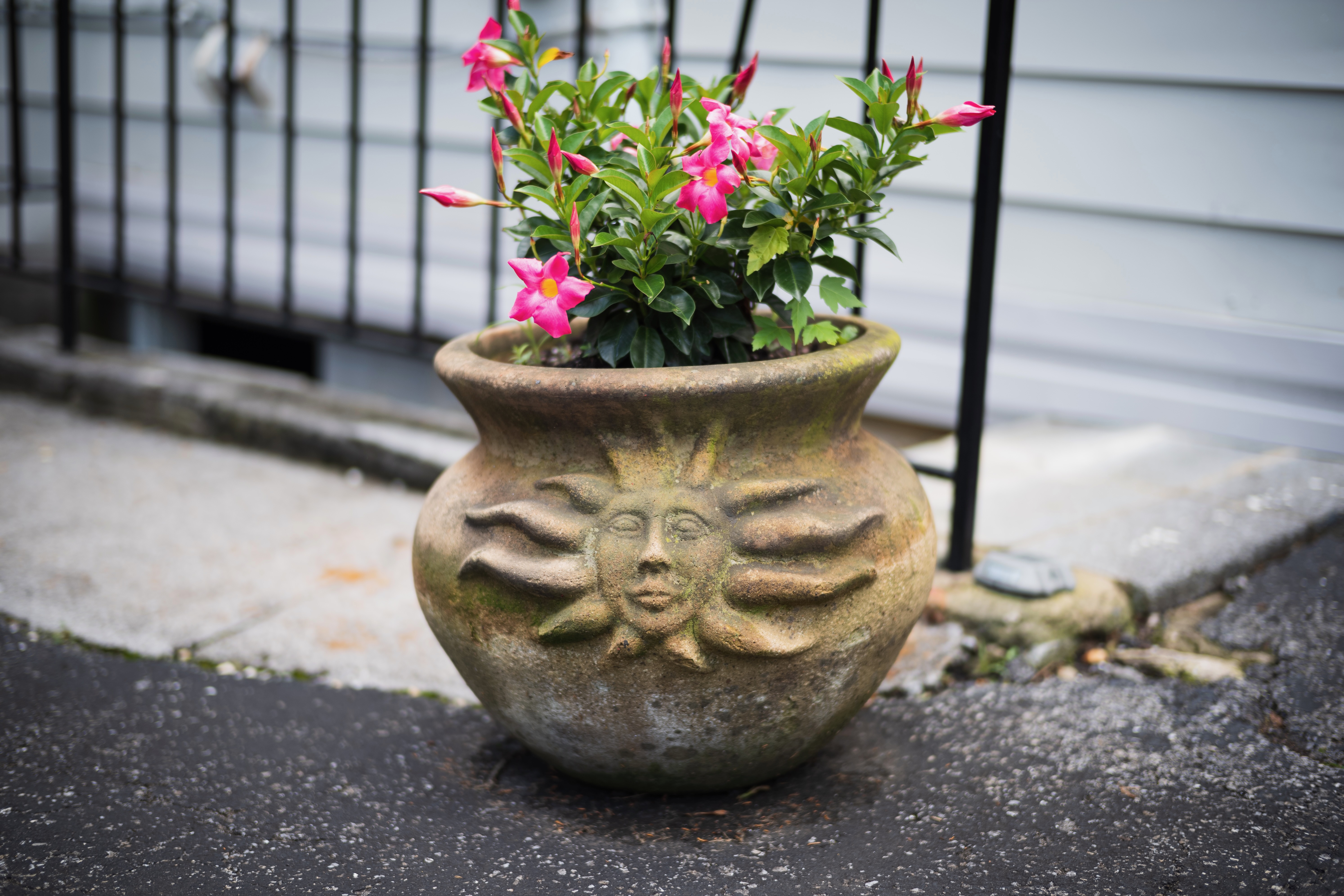A weathered clay pot adorned with a sun face cradles vibrant pink flowers, bringing a touch of whimsy to a serene corner. The soft, diffused natural light highlights the textures of the pot and the petals, creating a friendly and inviting atmosphere. Its placement against a simple backdrop, paired with a gentle focus, draws attention to the harmony between nature and art.