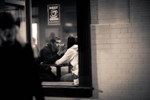 Two figures sit closely across a table, engaged in a deep conversation, their eyes locked and hands nearly touching. The dim lighting creates a cozy atmosphere, while the blurred silhouette of a passerby hints at the bustling world outside. The photograph evokes a sense of intimacy and focus amidst the distractions of life.
