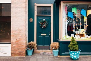 The photograph captures a quaint doorway adorned with a fresh holiday wreath, flanked by pots of dried foliage and a cheerful green shrub. The warm teal of the door contrasts beautifully with the rustic brick wall beside it, while the inviting storefront window reveals playful, colorful decor. The overcast lighting lends a soft, cozy ambiance, perfectly reflecting a serene, small-town charm.