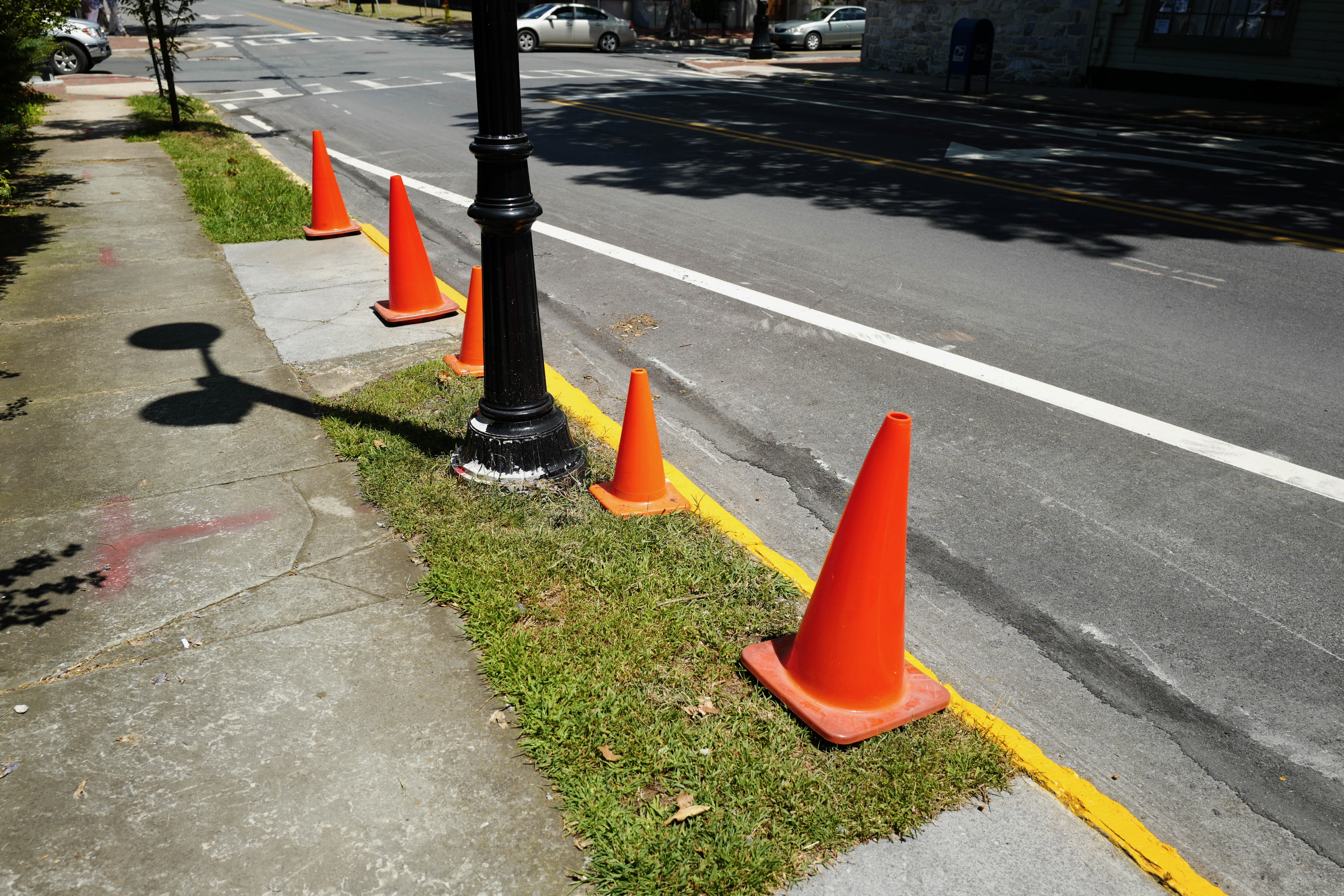 Five vibrant orange cones stand in a row near a lamppost, creating a stark contrast against the muted grey pavement and lush green grass. The lighting is bright and direct, enhancing the colors and shadows, which adds a sense of playfulness to this otherwise mundane city scene. A minimalistic composition draws the eye along the sidewalk, inviting curiosity about the purpose of these temporary barriers.