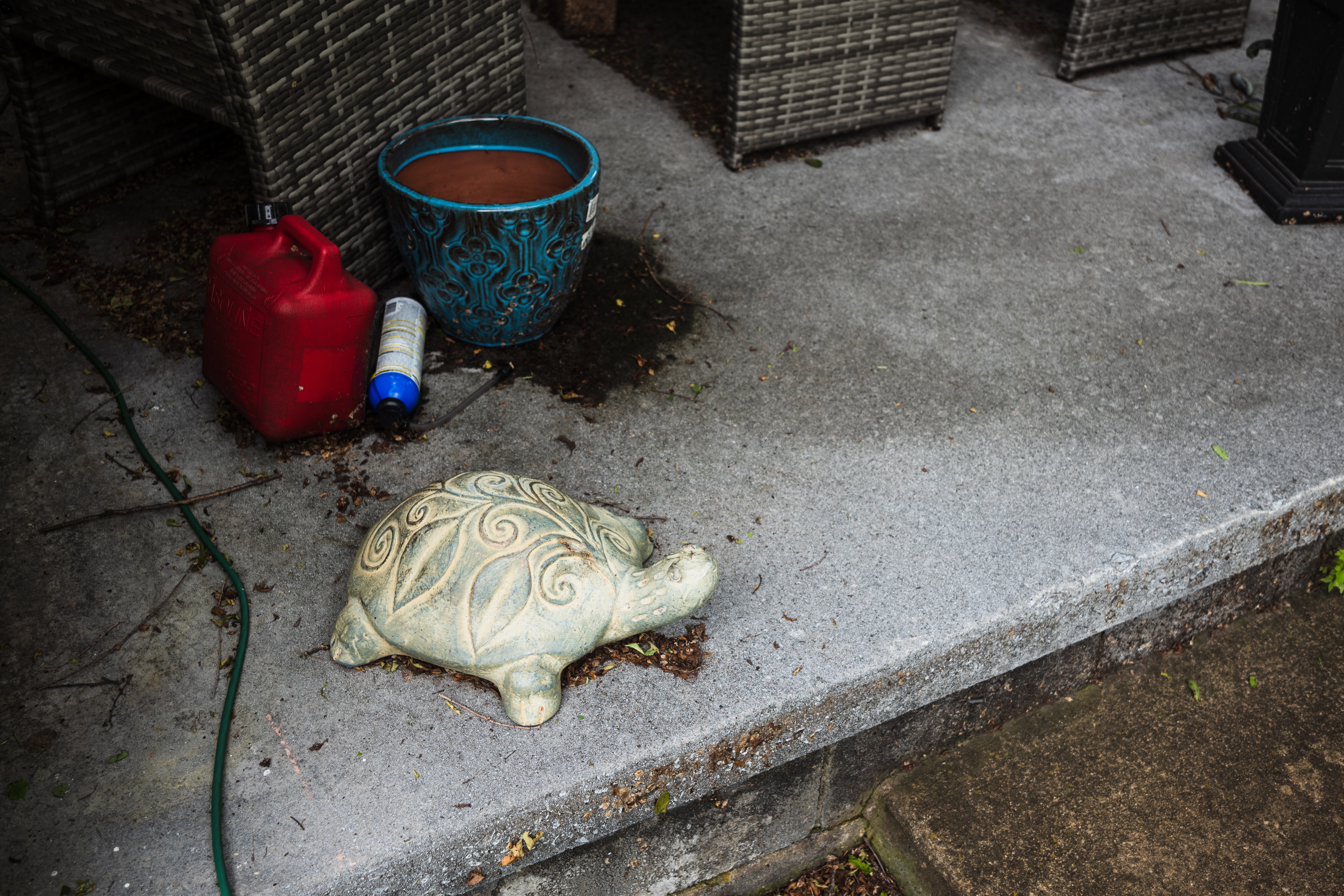 This photograph captures a serene moment in a backyard, featuring a decorative stone turtle resting on a weathered concrete slab. The muted lighting accentuates the earthy tones and textures of the surroundings, while a colorful pot and tools hint at nature's ongoing cycle just out of focus. A sense of nostalgia envelops the scene, inviting reflection on the passage of time in quiet repose.