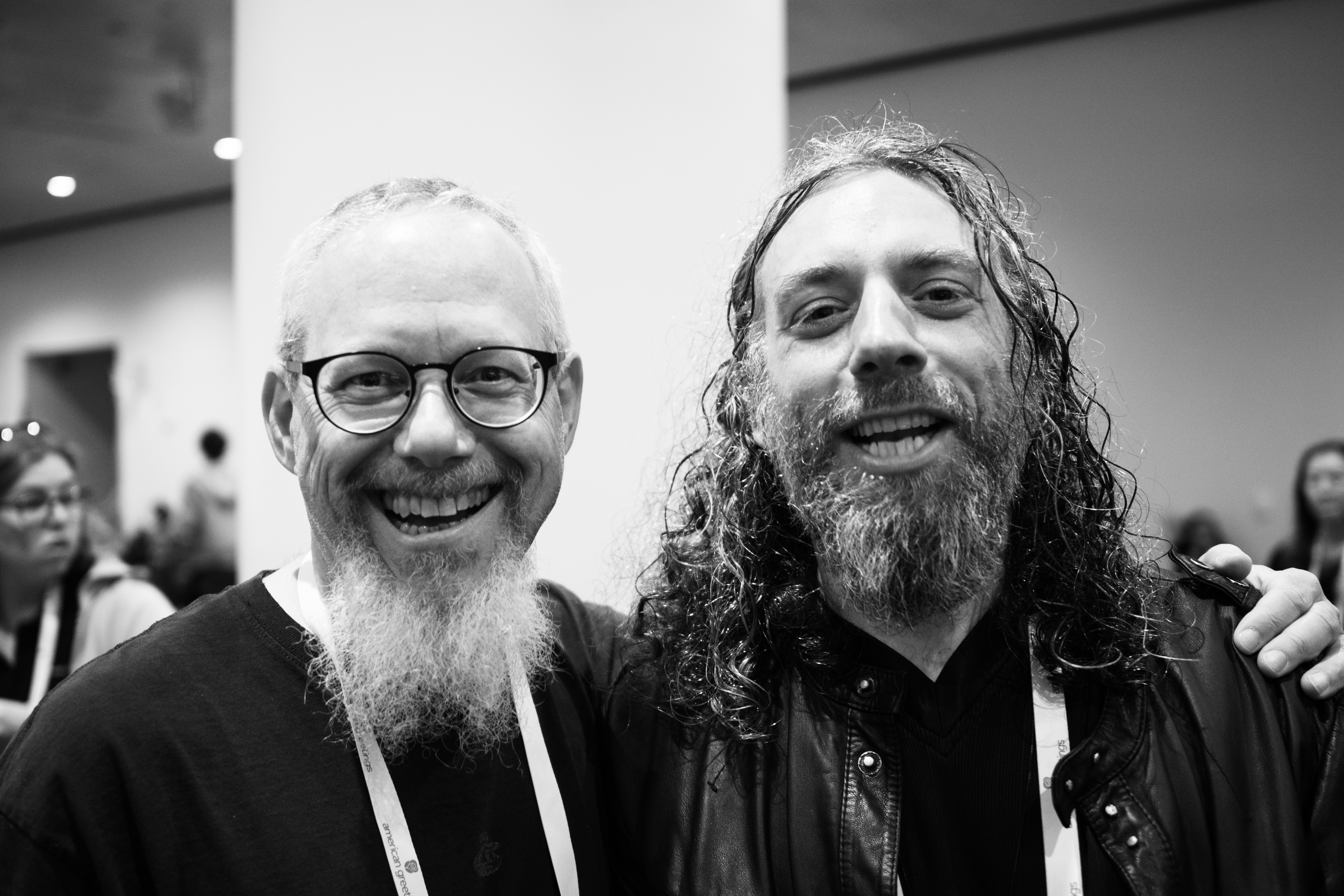 Two men share a joyful moment, their smiles radiating warmth and camaraderie against a minimalist backdrop. The black-and-white composition enhances the intimacy of their connection, highlighting their distinct hairstyles and beards. Soft, natural lighting adds a gentle touch to the scene, capturing the essence of friendship and shared experiences.