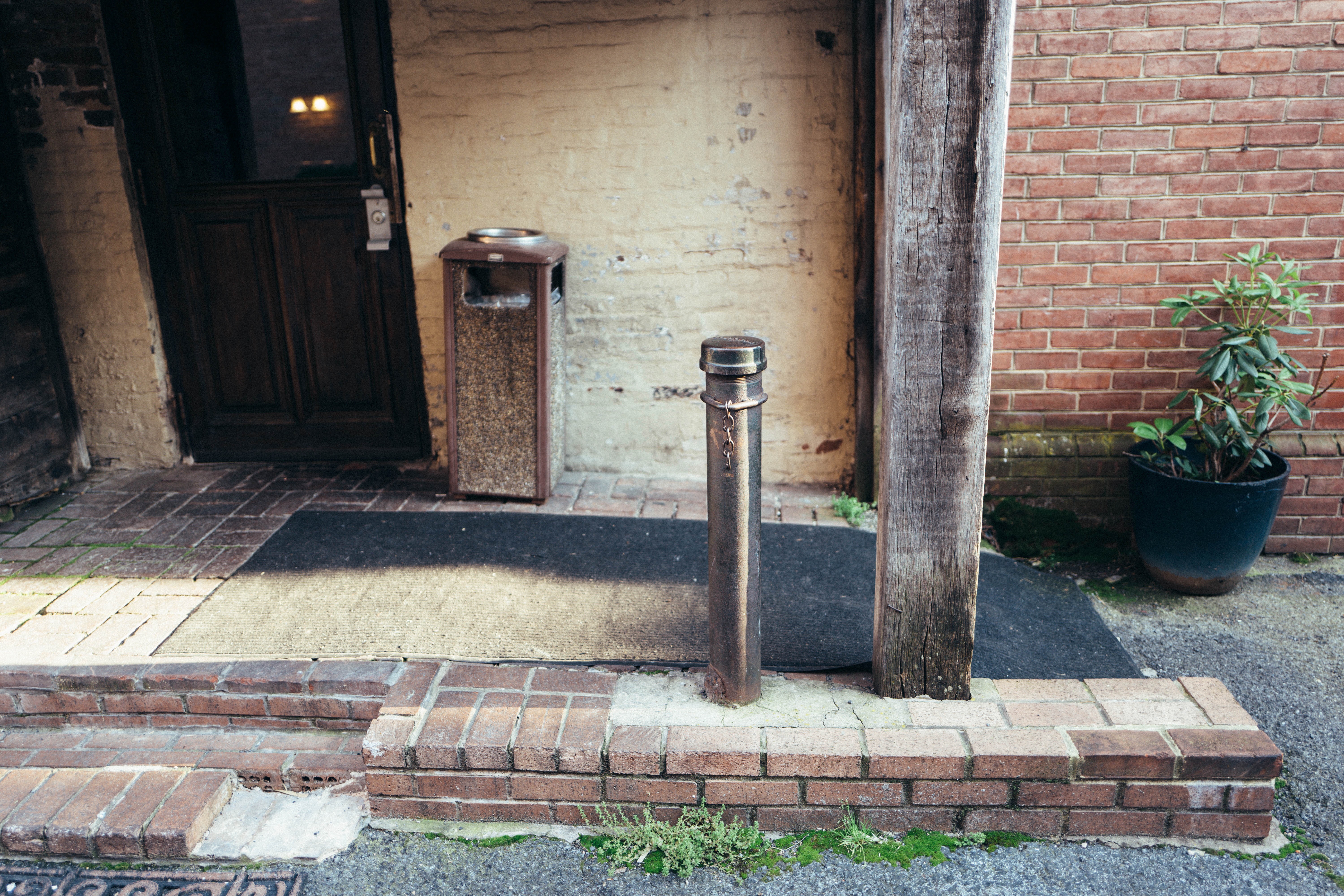The photograph captures a quiet entrance to a building, framed by a wooden post and a metal pipe, inviting reflection. Soft, natural light filters in, illuminating the weathered textures of the brick and stone, evoking a sense of nostalgia and stillness. The subtle interplay of shadow and light enhances the mood of solitude, hinting at stories untold in this tucked-away urban corner.