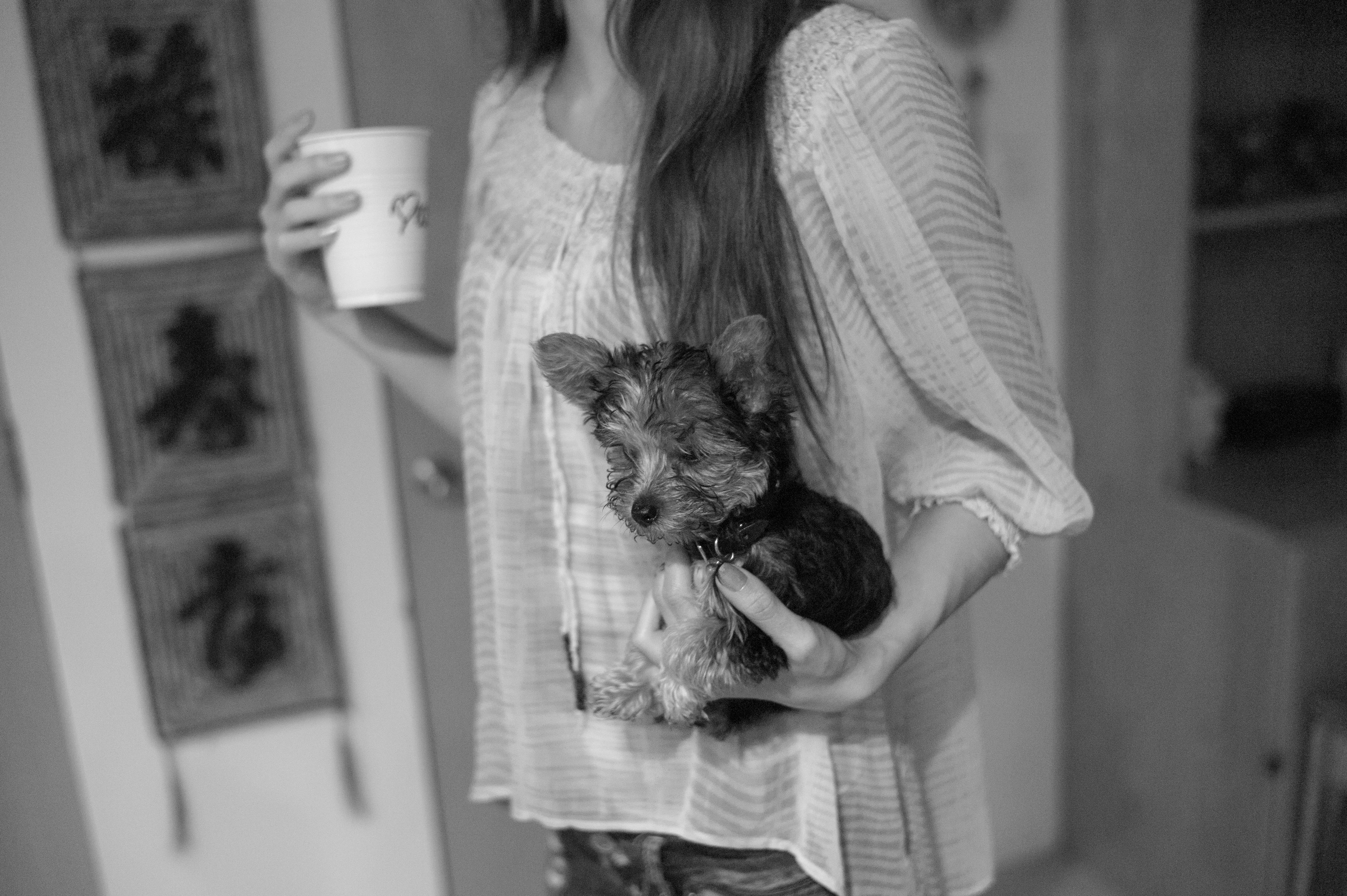 In this intimate black-and-white photograph, a young woman cradles a small dog in her arms while holding a drink in her other hand. The composition captures a cozy, domestic scene, with soft lighting that accentuates the warmth between the subjects. The blurred background hints at a homey environment, enhancing the mood of comfort and companionship.