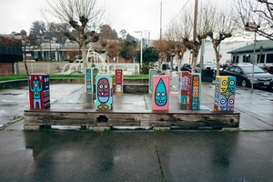 In a quaint urban park, vibrant, cartoonish sculptures stand defiantly against the muted greys of a rainy day. The playful colors of the artwork create a stark contrast with the wet pavement, inviting curiosity and delight. Sparse trees and a soft, overcast sky add to the contemplative mood, highlighting the interplay between nature and creativity.