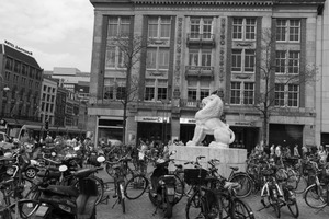 In a bustling urban square, a majestic lion statue stands as a focal point among a sea of bicycles and pedestrians. The monochrome tones enhance the mood of quiet contemplation amid the vibrant chaos of city life, while the surrounding architecture carries an air of historical significance. The composition creates a striking juxtaposition between the solid, enduring lion and the fleeting nature of urban movement around it.