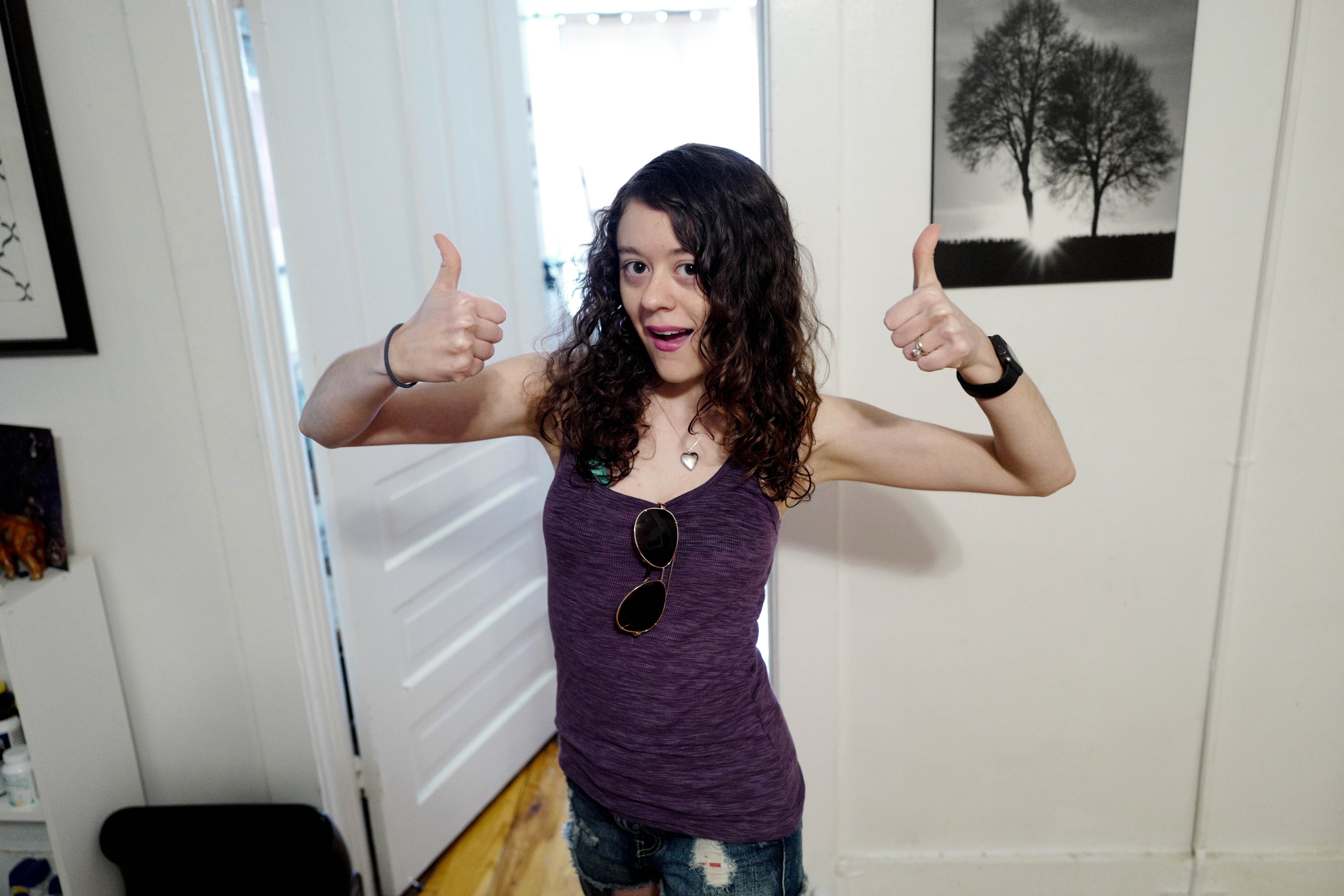 This photograph captures a young woman exuding joy with her thumbs up and a playful expression. The bright lighting accentuates her casual style and lively energy, while the minimalist background of an indoor setting adds a sense of warmth and familiarity. The overall mood is lighthearted and inviting, reflecting a moment of carefree happiness.