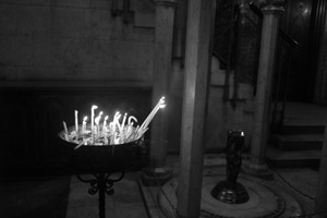 In a dimly lit space, a flickering array of candles stands as the main subject, casting soft, wavering shadows on the stone walls. The black and white composition adds a sense of solemnity and timelessness, evoking a feeling of introspection and reverence. The contrast between the bright candle flames and the surrounding darkness creates a hauntingly beautiful atmosphere, inviting contemplation.