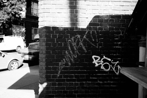 This black and white photograph captures a textured brick wall where shadows and graffiti intermingle, creating an intriguing interplay of light and dark. The angled light from the street casts dramatic shapes, adding a layer of depth to the composition, while the surrounding cars and urban backdrop hint at a lively, yet transient environment. The overall mood evokes a sense of gritty authenticity, inviting viewers to ponder the stories embedded within the urban landscape.