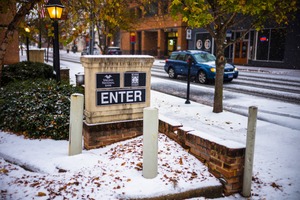 In a softly lit winter scene, a prominent sign reading 'ENTER' stands at the forefront, framed by gently falling snowflakes. The ambiance is serene and inviting, contrasting with the chilly hues of the snow-covered ground and the muted colors of the nearby buildings. The cozy glow of the streetlamp adds warmth to the composition, creating a sense of calm in this quiet urban setting.