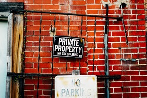 The photograph captures a stark contrast between a weathered brick wall and two authoritative signs, declaring 'Private Property' and 'No Parking.' The composition is imbued with an air of restriction and abandonment, highlighted by the muted colors and shadows that dance across the bricks, evoking a sense of forgotten spaces. The tangled vines creeping along the sign add a touch of nature, hinting at resilience amidst urban decay.